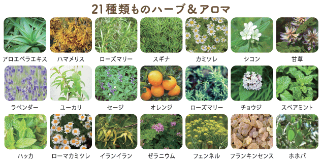 水、ラウレス-4カルボン酸Na、コミカドプロピルベタイン、コミカドDEA、ペンチレングリコール、ココイルメチルタウリンNa、BG、アロエベラ葉エキス、ハマメリスエキス、ローズマリー葉エキス、スギナエキス、カミツレ花エキス、ムラサキ根エキス、カンゾウ根エキス、ラベンダー油、ユーカリ油、セージ油、オレンジ油、ローズマリー油、チョウジ葉油、スペアミント油、ハッカ油、ローマカミツレ花油、イランイラン花油、ニオイテンジクアオイ花油、ウイキョウ果実油、ニュウコウジュ油、ホホバ種子油、ポリクオタニウム-10、カプリル酸グリセリル、エチルヘキシルグリセリン、トコフェロール、ステアラミドエチルジエチルアミン、クエン酸、エタノール、ミリスチン酸ポリグリセリル-10